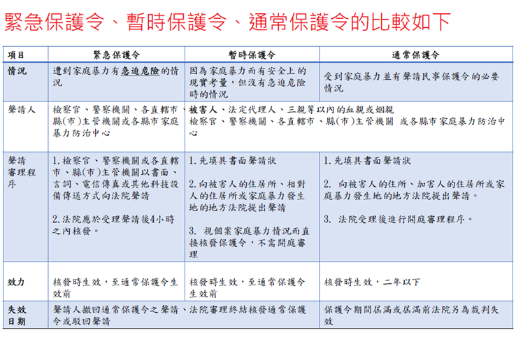 接下來,我們來認識《家庭暴力防治法》下的三種保護令:緊急保護令、暫時保護令、通常保護令。